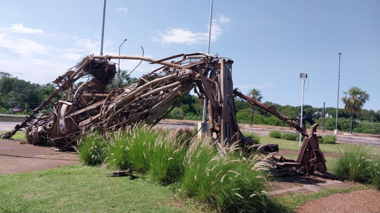 Se trata de la obra ubicada en la intersección de las avenidas Costanera Sur Juan Pablo II y Jorge Romero, que tiene 17 metros de altura y fue realizada con más de 15 toneladas de hierro reciclado. Como puede apreciarse en las fotos, la gigantesca obra cedió ante los fuertes vientos y terminó en el suelo. Según detallaron, el óxido propio del material con el que está hecho generó un quiebre en uno de sus tres parantes principales y más los fuertes vientos de las últimas semanas la escultura había terminado inclinada hacia la derecha hasta que finalmente cayó en horas de la madrugada de hoy.