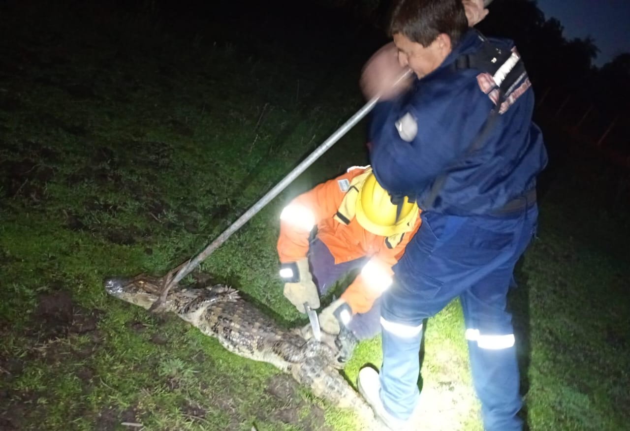 Ante la premura del caso, el personal policial se constituyó de inmediato al lugar, donde con las medidas de seguridad correspondientes, se logró acorralar e inmovilizar al animal tratándose de un caimán, finalmente con la colaboración del personal de Bomberos Voluntarios de la localidad, quienes cuentan equipamiento adecuado para este tipo de procedimientos concretaron la captura y posterior traslado seguro del ejemplar.