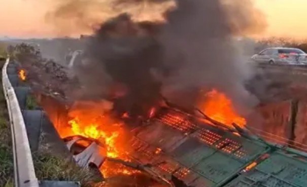 Tragedia en Parada Pucheta: Un camión que transportaba vehículos despistó y se incendio, el chofer murió quemado