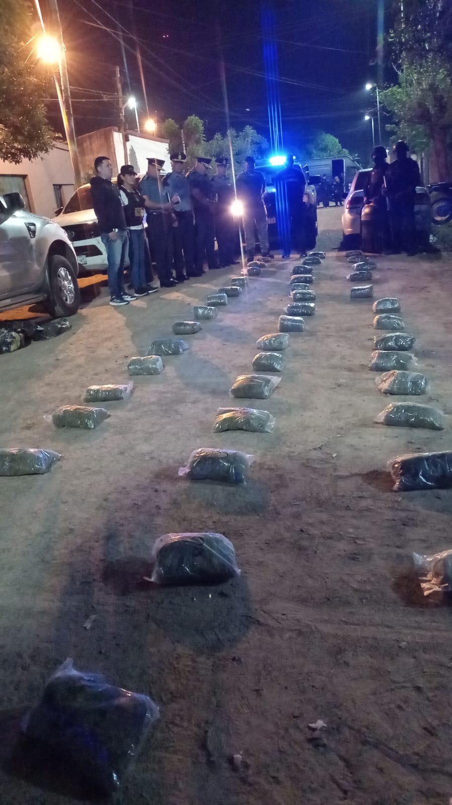 Por tal motivo, posteriormente los mencionados efectivos con la autorización judicial respectiva procedieron al secuestró preventivo de 05 bultos con varios paquetes en su interior conteniendo floración de origen vegetal, por lo que se solicitó la presencia de personal de la Dirección General de Drogas Peligrosas y Crimen Organizado, quienes efectuaron el correspondiente narcotes, arrojando positivo para marihuana, siendo 65 paquetes, con un total de 35,557 kilogramos, dando un aforo aproximado de 127 millones de pesos. En el marco investigativo, existen dos hombres mayores de edad demorados. También, colaboraron en el lugar efectivos del Grupo PAR quienes efectuaron la cobertura de seguridad del caso.