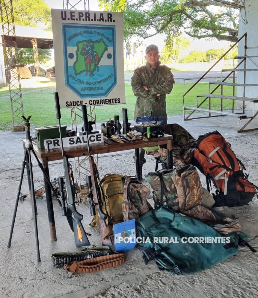 Los distintos trabajos investigativos llevaron a los policías, hasta una cabaña ubicada sobre Ruta provincial N°23 – 4°sección Sauce, lugar que funcionaría como hospedaje de ocasionales transeúntes, en ese marco, secuestraron armas de fuego (fusiles con miras y silenciadores), visores nocturnos, cartuchos, vainas, ropa y mochilas mimetizadas, linternas, cuchillos y accesorios para caza.