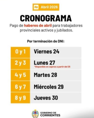 El pago del mes de abril estará disponible por terminación de DNI, para trabajadores activos y jubilados de la Administración Pública de Corrientes